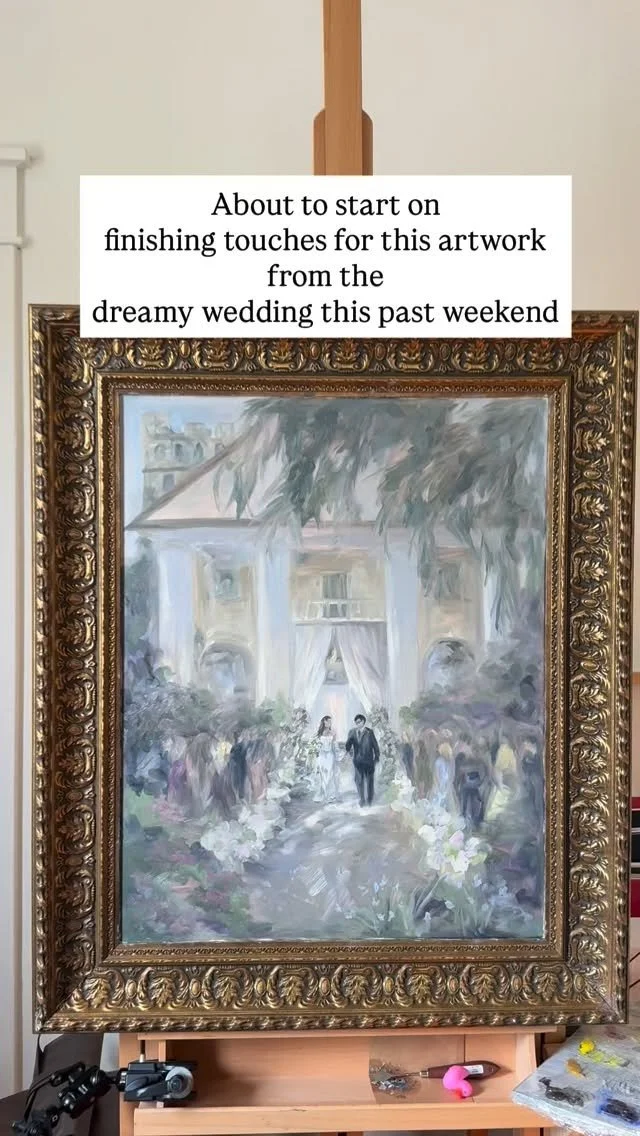 She liked the idea of the painting not being heavy on the focus of the wedding, but more a dramatic painting of the two of them. We chose to include the guests around the edges of the painting moving through the woods in a blurred kind of way to really lean into the…