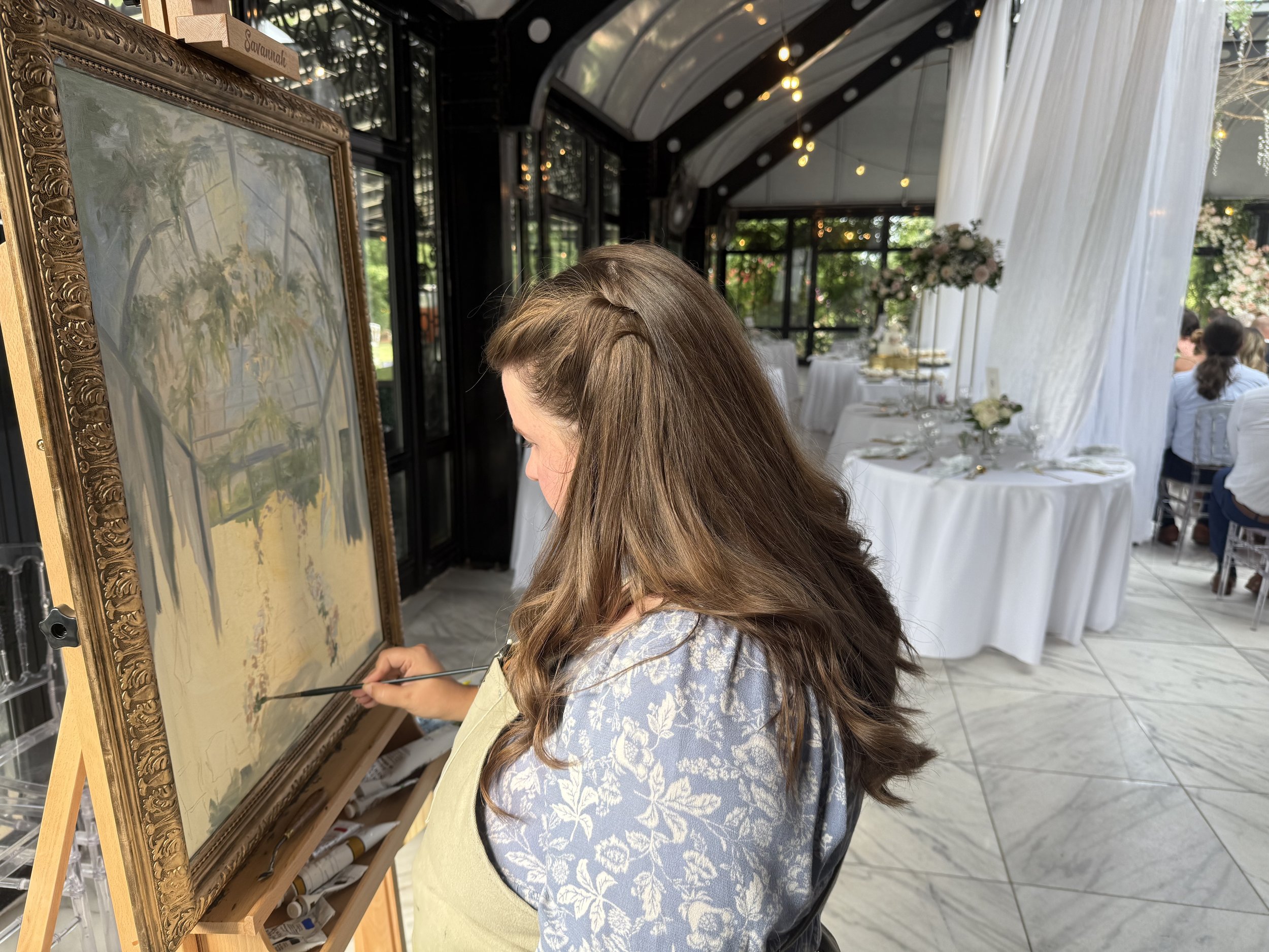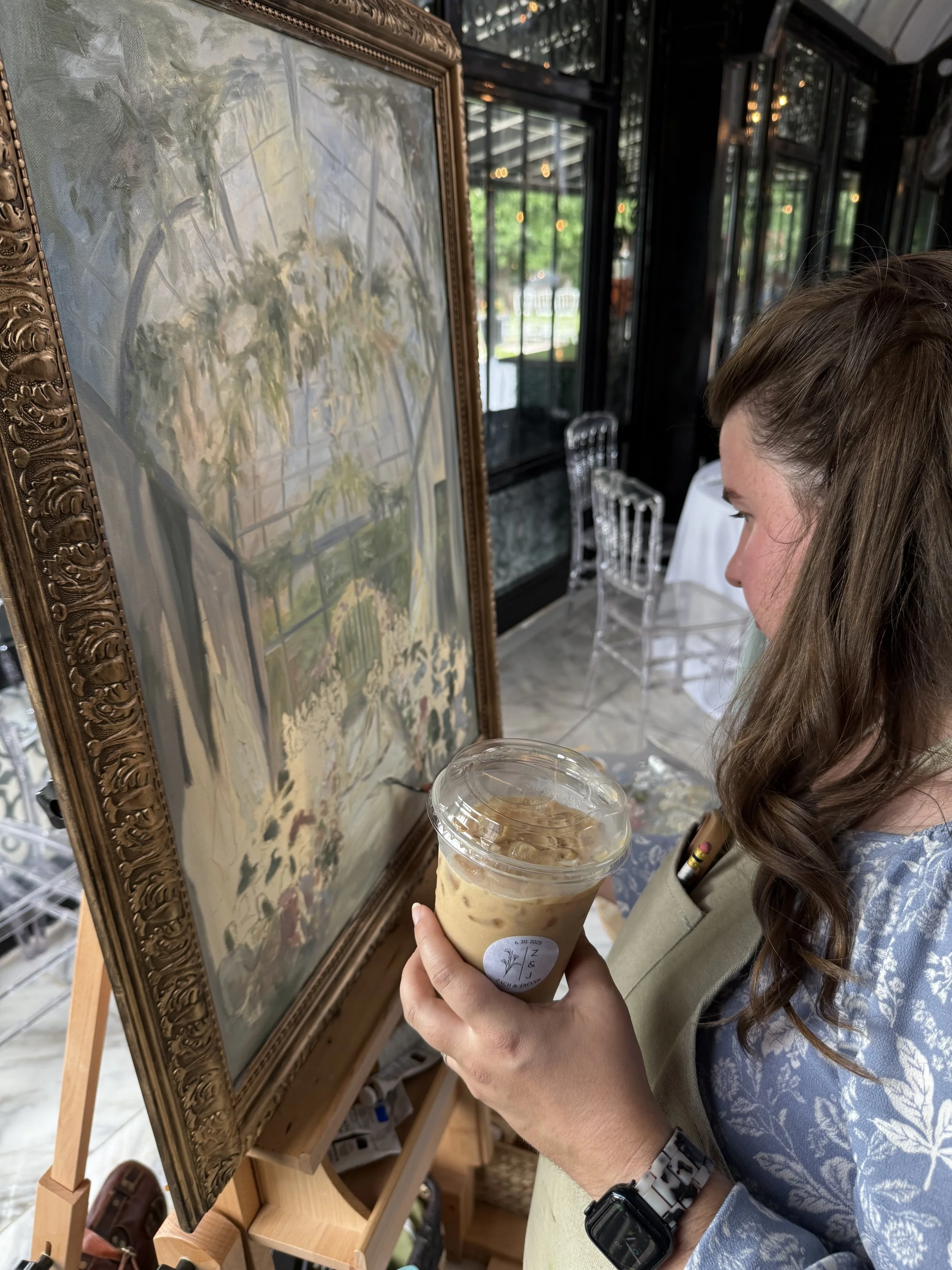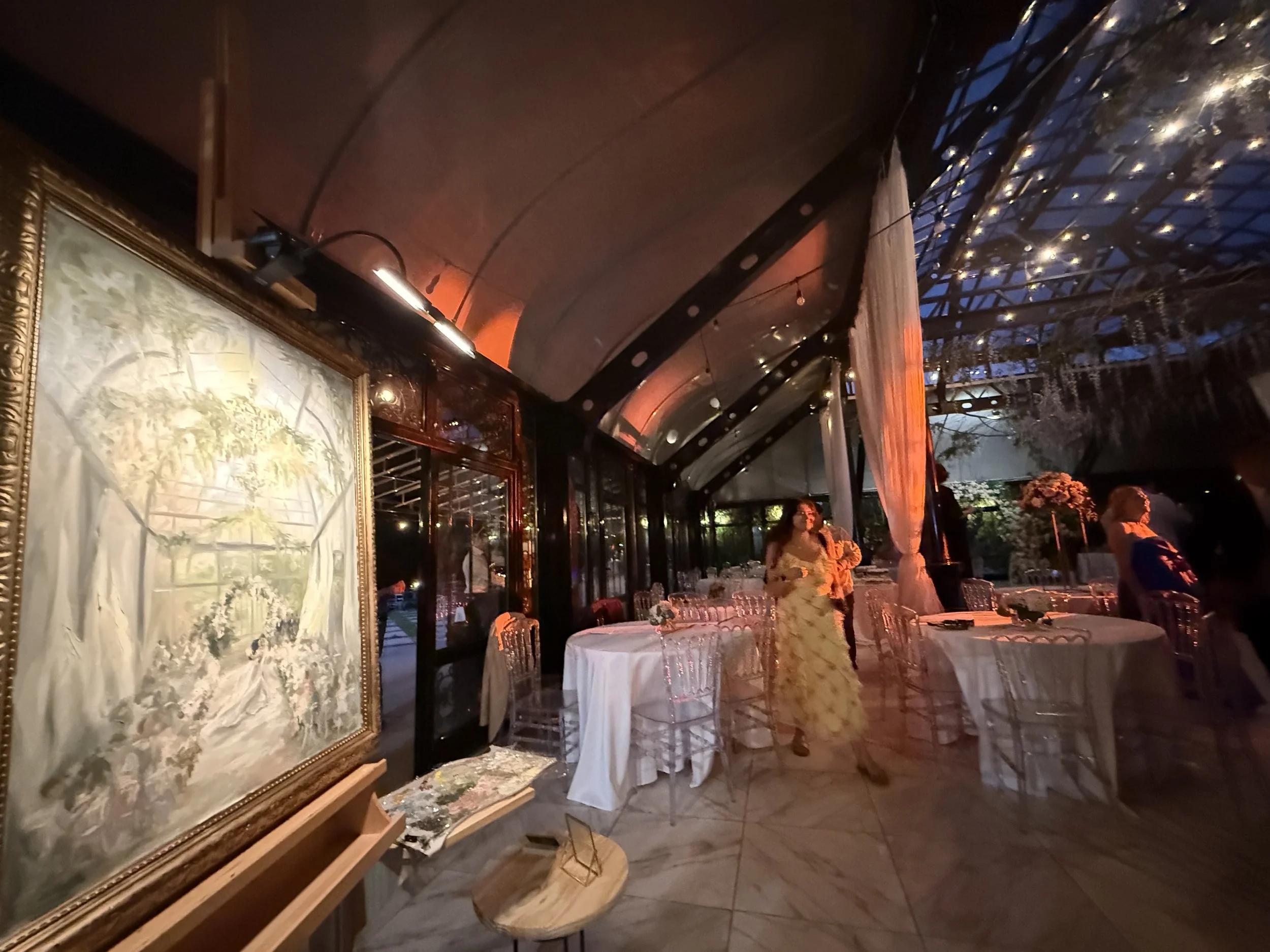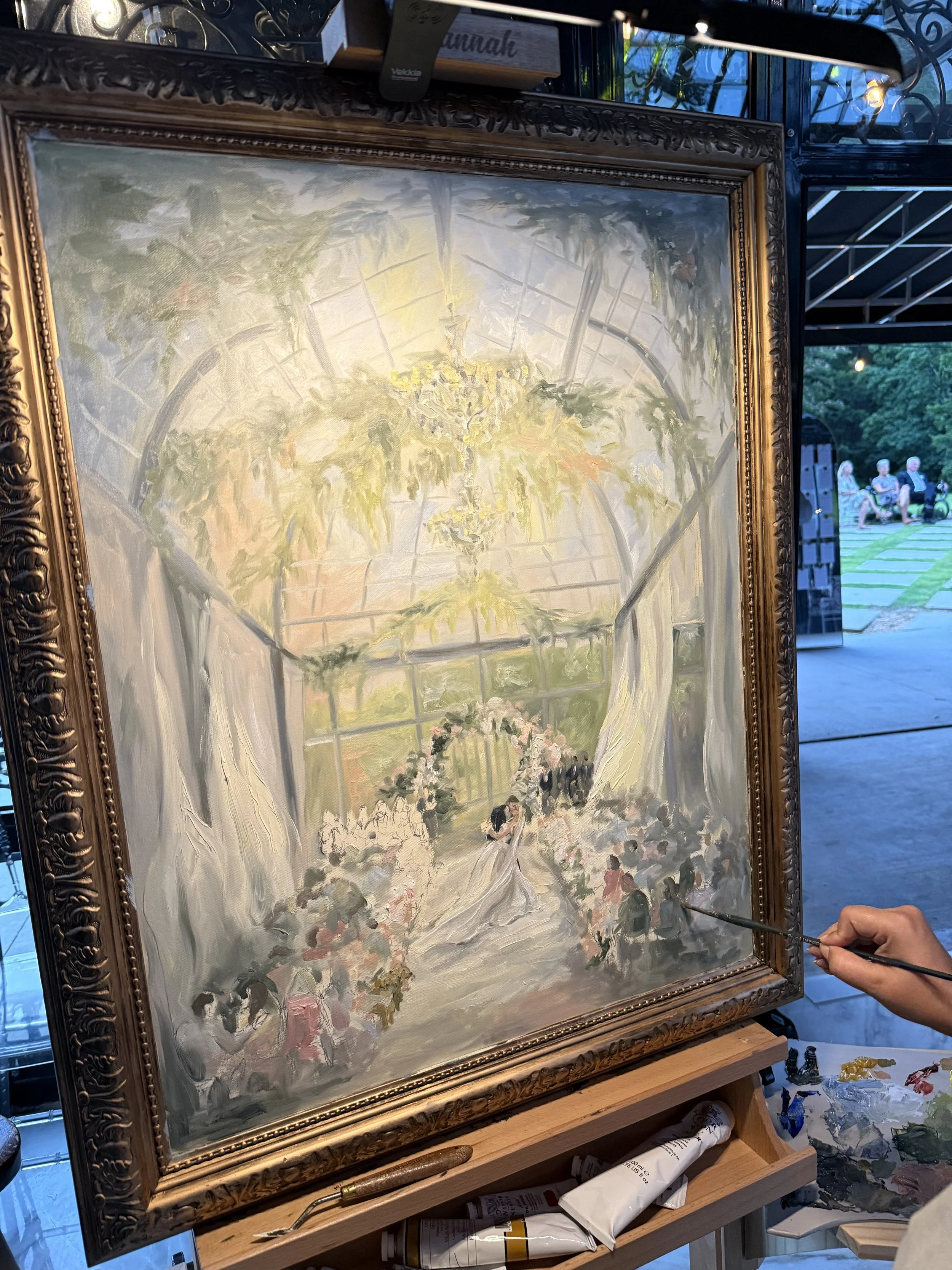 During our “brainstorm” chat about their painting, they both dreamed of something that had a soft summertime feel that really captured the vaulted glass ceilings and greenhouse tones of Edinburgh West. I was MORE than thrilled to hear their dreams, because I too was dying to capture the drama that came naturally to this timeless venue. While I had painted at this venue before, this was the first time I would get to paint inside!
