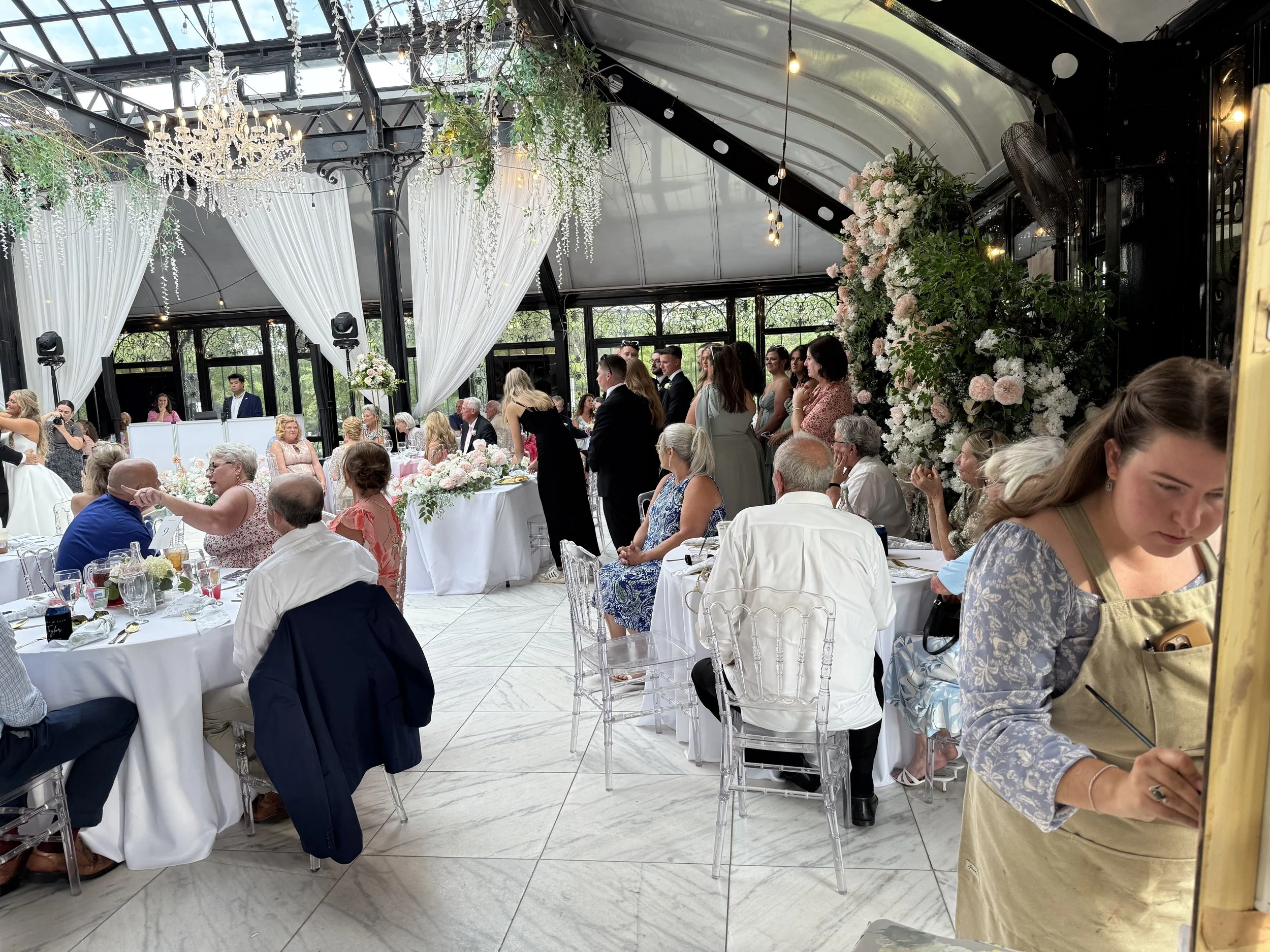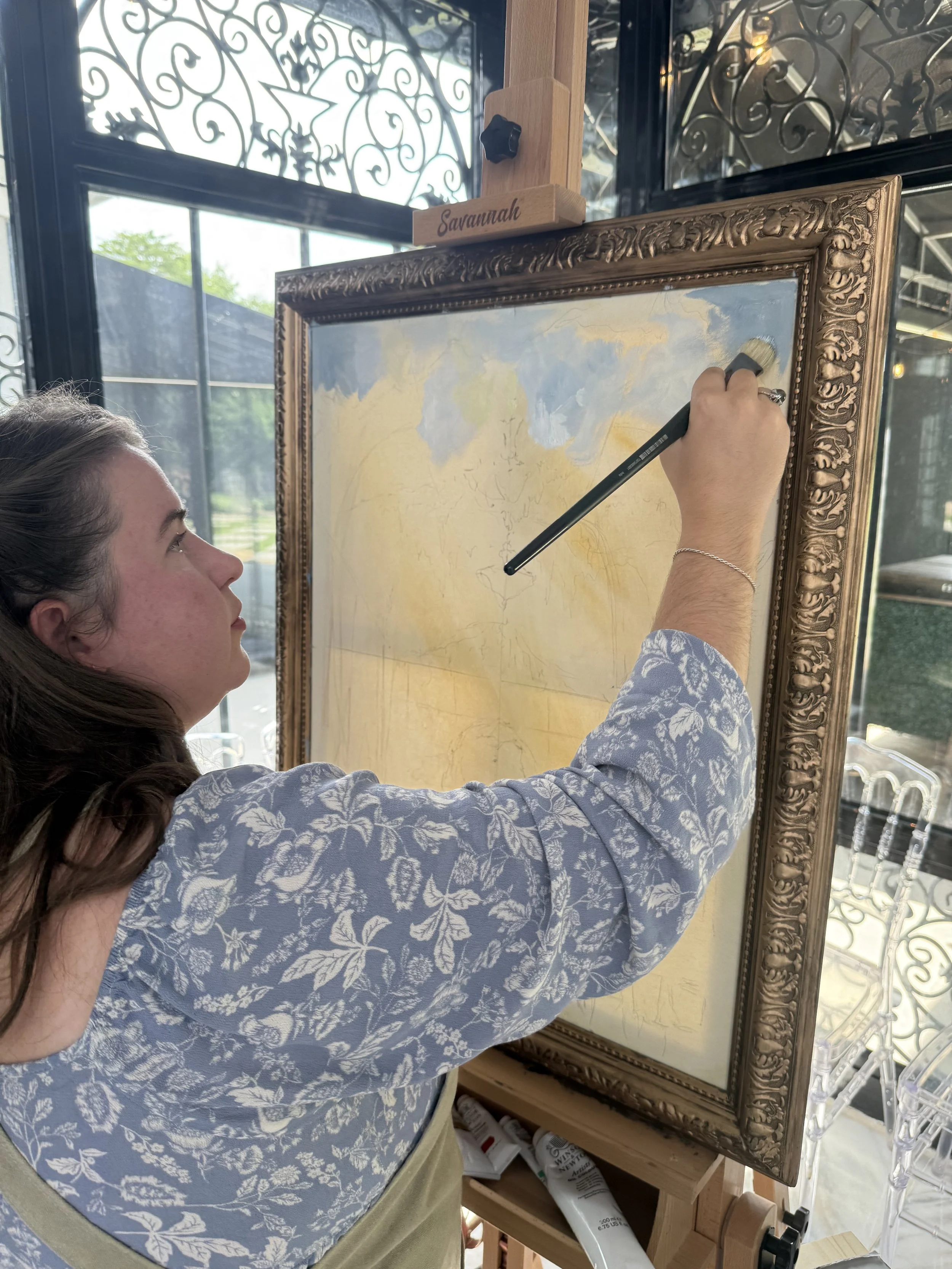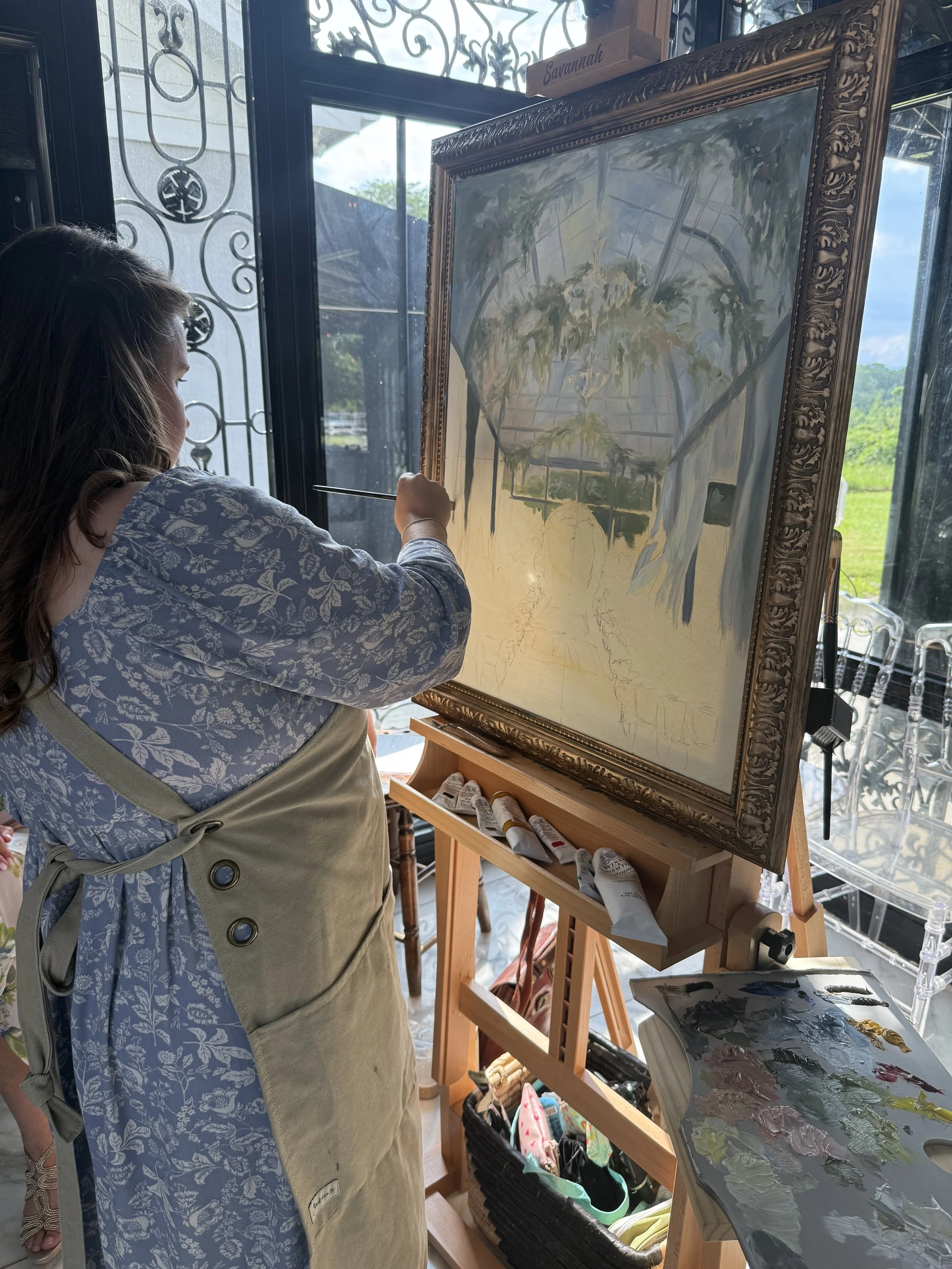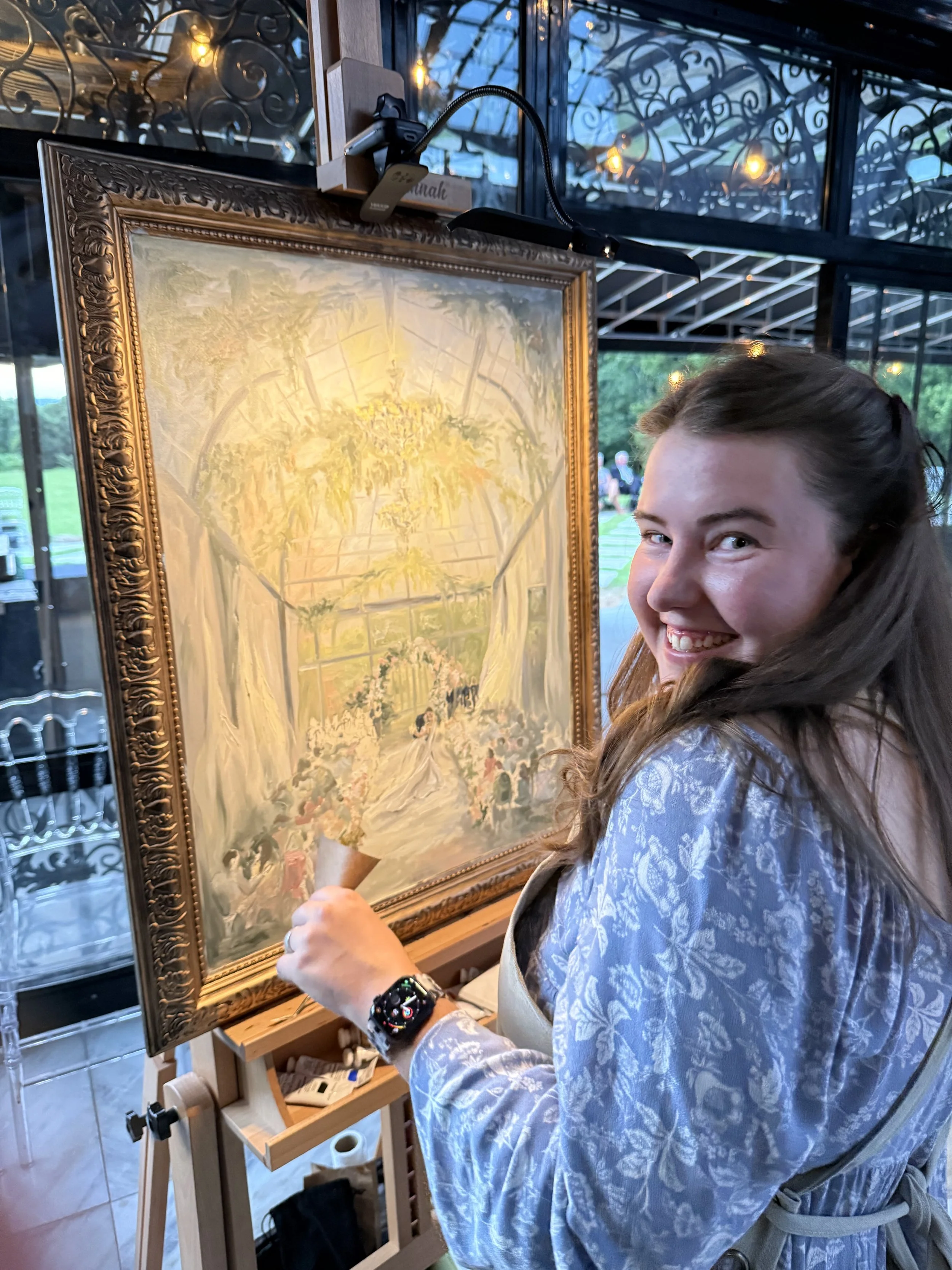 During our “brainstorm” chat about their painting, they both dreamed of something that had a soft summertime feel that really captured the vaulted glass ceilings and greenhouse tones of Edinburgh West. I was MORE than thrilled to hear their dreams, because I too was dying to capture the drama that came naturally to this timeless venue. While I had painted at this venue before, this was the first time I would get to paint inside!