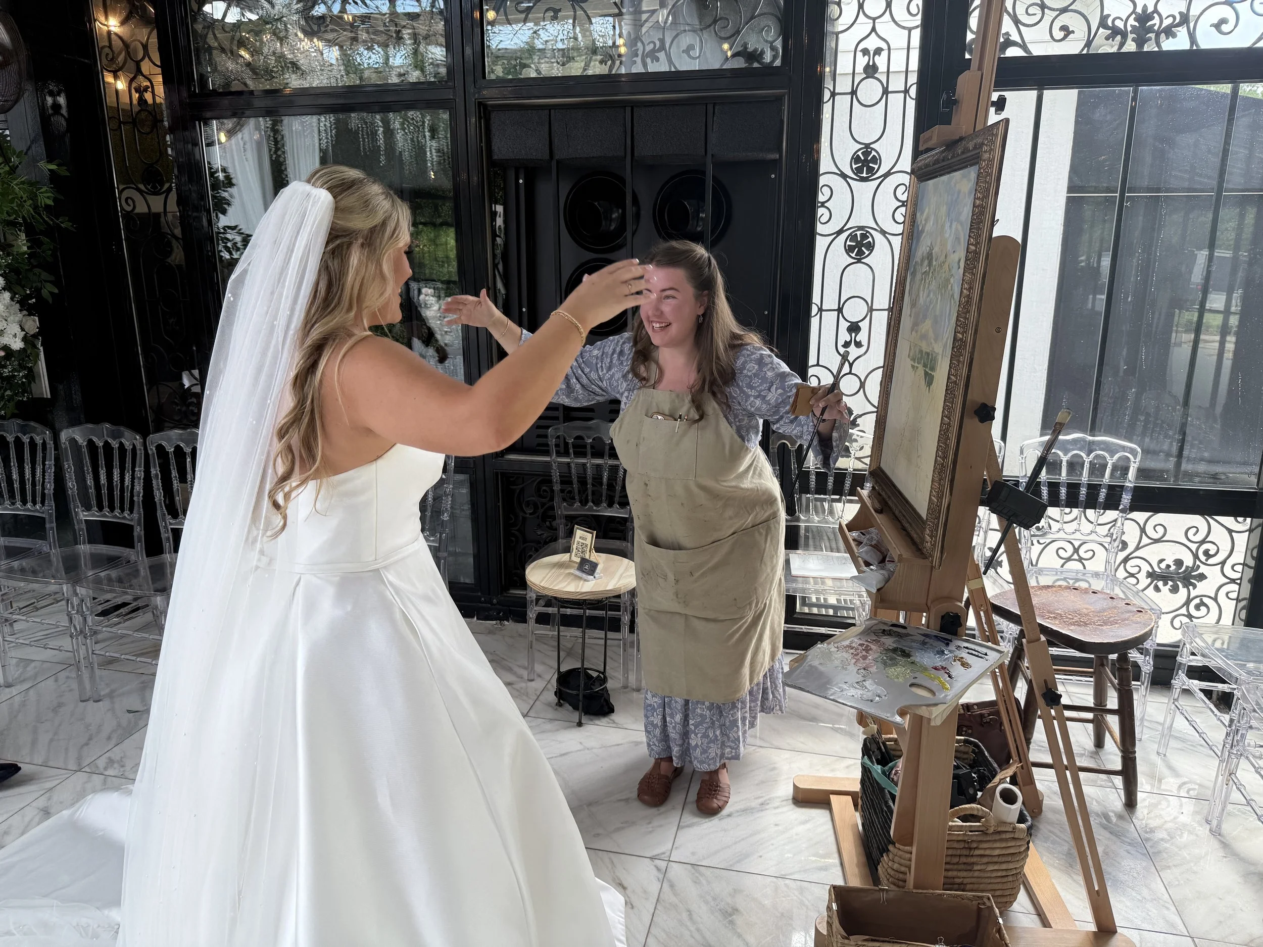 This is me giving an air hug to the bride because there is no way I’m getting paint on her dress 😂